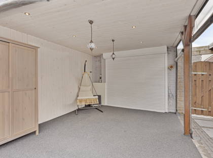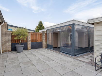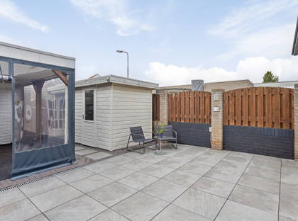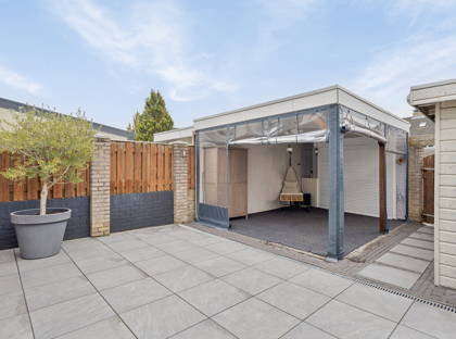 + De grote achtertuin is geheel bestraat dus onderhoudsarm. In de tuin bevindt zich een royale overkapping, die is voorzien van geïntegreerde spotverlichting. Dit overkapte terras kan met transparant, water- en winddicht doek geheel gesloten worden. Het biedt dan een heerlijke beschutte plek voor een zitje. In de tuin staat ook een houten berging. De poort achterin geeft een achterom.