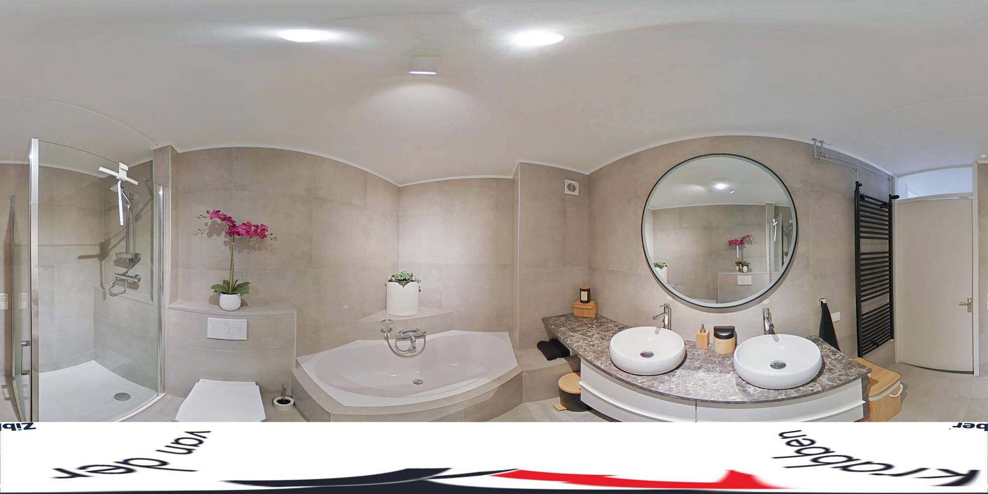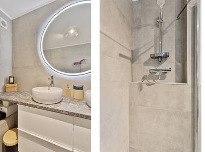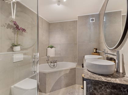 + De moderne badkamer (2023) is geheel betegeld en stijlvol uitgevoerd met een ligbad, inloopdouche, wandtoilet en badkamermeubel met opzetwaskommen. Hierboven hangt een spiegel met led-verlichting.