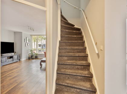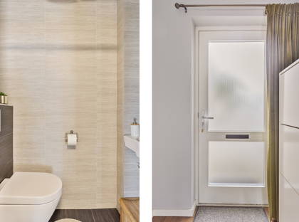 + Binnenkomst in de hal met de meterkast, toiletruimte en trap. De moderne toiletruimte (2023) bevat een wandtoilet en fonteintje. De hout look pvc vloer (inclusief vloerverwarming) in de hal gaat verder in de woonkamer en leefkeuken.