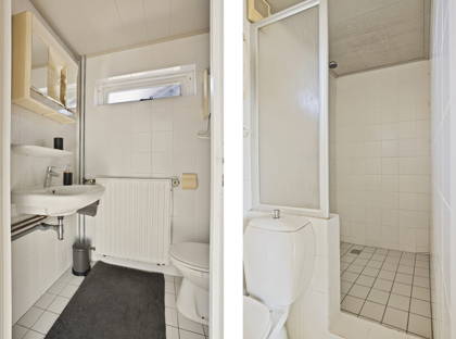 De badkamer is functioneel ingericht met een douche, toilet en wastafel.