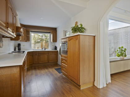 Via de hal met meterkast en trapkast kom je in de ruime doorzonwoonkamer. Dankzij de grote raampartijen aan zowel de voor- als achterzijde geniet de woonkamer van veel natuurlijk licht. De ruimte is afgewerkt met een laminaatvloer en spachtelputz wanden en beschikt over een sfeervolle gashaard.