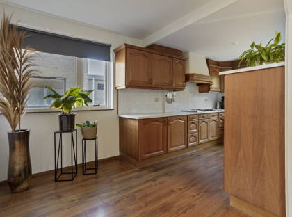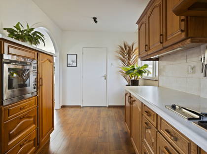 De keuken is voorzien van diverse inbouwapparatuur, waaronder een koelkast, diepvries, oven en een gasfornuis met grillfunctie.
