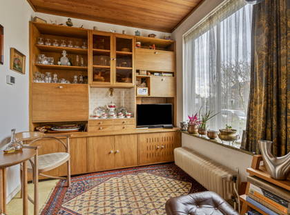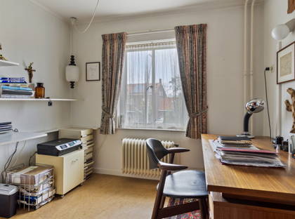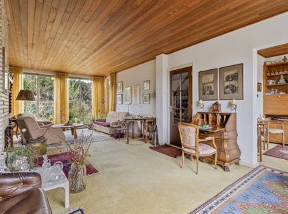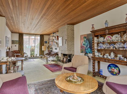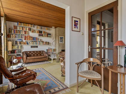 + De ruimtelijke woonkamer heeft een zeer licht karakter. Grote vensters tot op de vloer laten het licht aan de voor- en achterzijde rijkelijk binnen. Een tuindeur geeft toegang tot de achtertuin. In het midden van een wand bevindt zich een open haard in een muur van schoonmetselwerk. Er is een open doorgang naar een knusse zithoek met raam aan de voorzijde. Behalve als extra zithoek is deze ruimte ook heel geschikt als werkplek.