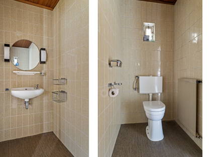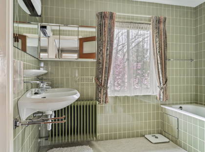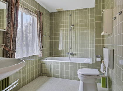 + De grote badkamer is toegankelijk via de overloop en vanuit de slaapkamer aan de achterzijde. De badkamer is geheel betegeld en is voorzien van een raam, bad-douchecombinatie, toilet en dubbele wastafel.