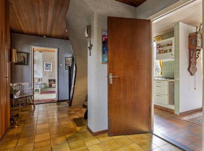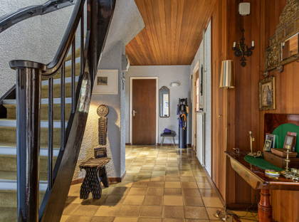 + Binnenkomst in de royale hal met de meterkast, trap en geheel betegelde toiletruimte. In de hal ligt een tegelvloer.