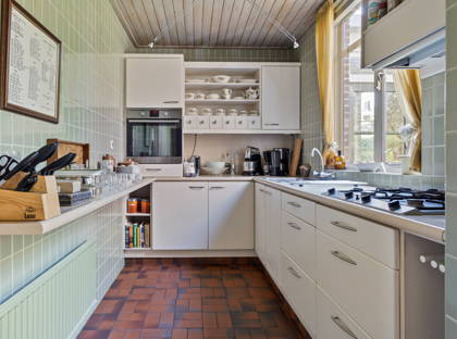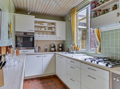 + In de tuingerichte, lichte leefkeuken is bij de tuindeur en een groot raam een mooie plaats voor de eettafel. In het kookgedeelte staat onder een raam een keukenblok in hoekopstelling met 4-pits gaskookplaat, afzuigkap en oven. In de keuken ligt een tegelvloer.