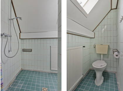 + Op de bovenverdieping bevindt zich een geheel betegelde badkamer met een dakraam, inloopdouche en toilet.