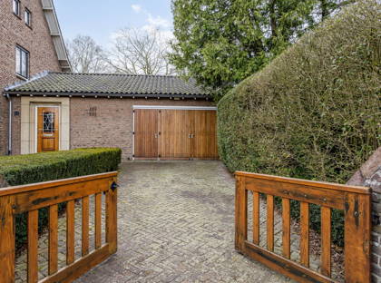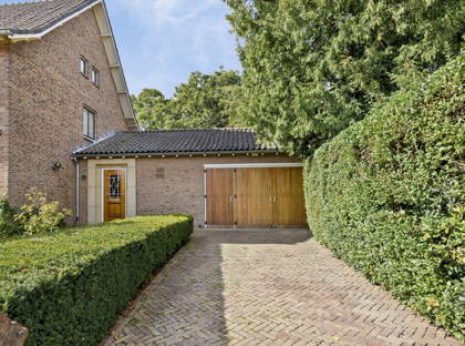+ Parkeren op eigen oprit met plaats voor twee auto's en in de garage. De oprit heeft een lage dubbele toegangspoort. De garage is toegankelijk via een dubbele deur en een aparte loopdeur. Er is een binnendeur naar de bijkeuken en een buitendeur naar de achtertuin. In de garage leidt een losse trap naar een grote bergzolder.