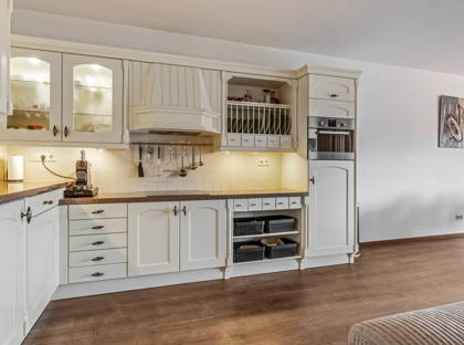 + In de open keuken staat een keukenblok in hoekopstelling. Het is uitgevoerd met een 4-pits keramische kookplaat, afzuigkap, combi-oven, koelkast en vaatwasser.