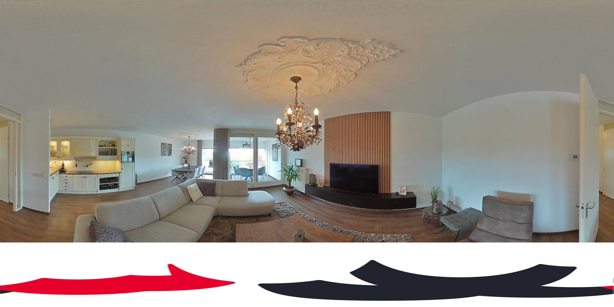 + L-vormige woonkamer krijgt volop lichtinval via grote ramen tot op de vloer en een schuifpui naar de loggia.
