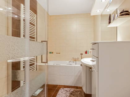 + Moderne badkamer is geheel betegeld en voorzien van een ligbad, douche met regendouche, designradiator, wandtoilet en uitgebreid badkamermeubel.