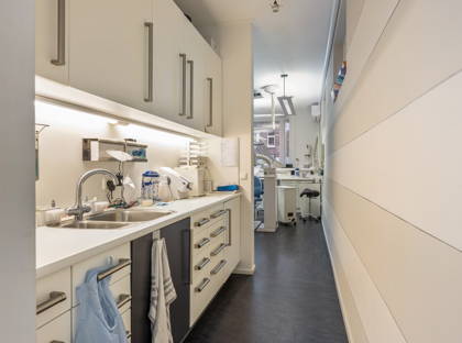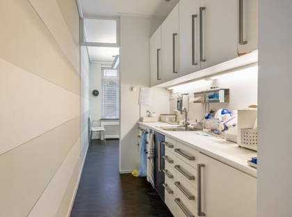 + Plafonds met geïntegreerde spotverlichting in de hal, de aansluitende wachtruimte en de pantry.
