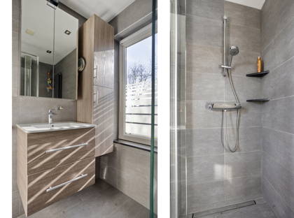 Ook op de verdieping biedt de woning veel wooncomfort. Hier bevinden zich drie slaapkamers en een complete badkamer met vloerverwarming. Via een vaste trap bereik je bovendien de zolderverdieping, die naar wens kan worden ingericht als extra slaapkamer, werkruimte of hobbykamer.