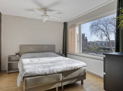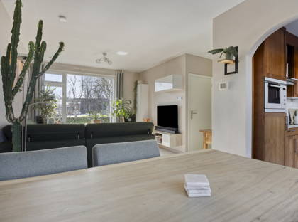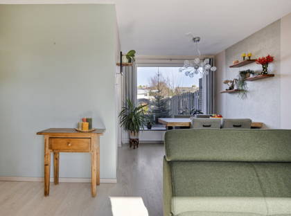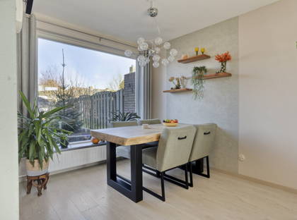 Binnen in de woning valt direct de fijne lichtinval op. De doorzonwoonkamer heeft grote ramen aan zowel de voor- als achterzijde, waardoor het daglicht rijkelijk naar binnen valt. De strakke stucwanden en het stucplafond zorgen voor een verzorgde en rustige uitstraling. Samen met de praktische indeling maakt dit de woonkamer tot een comfortabele plek om te ontspannen of gezellig samen te zijn.