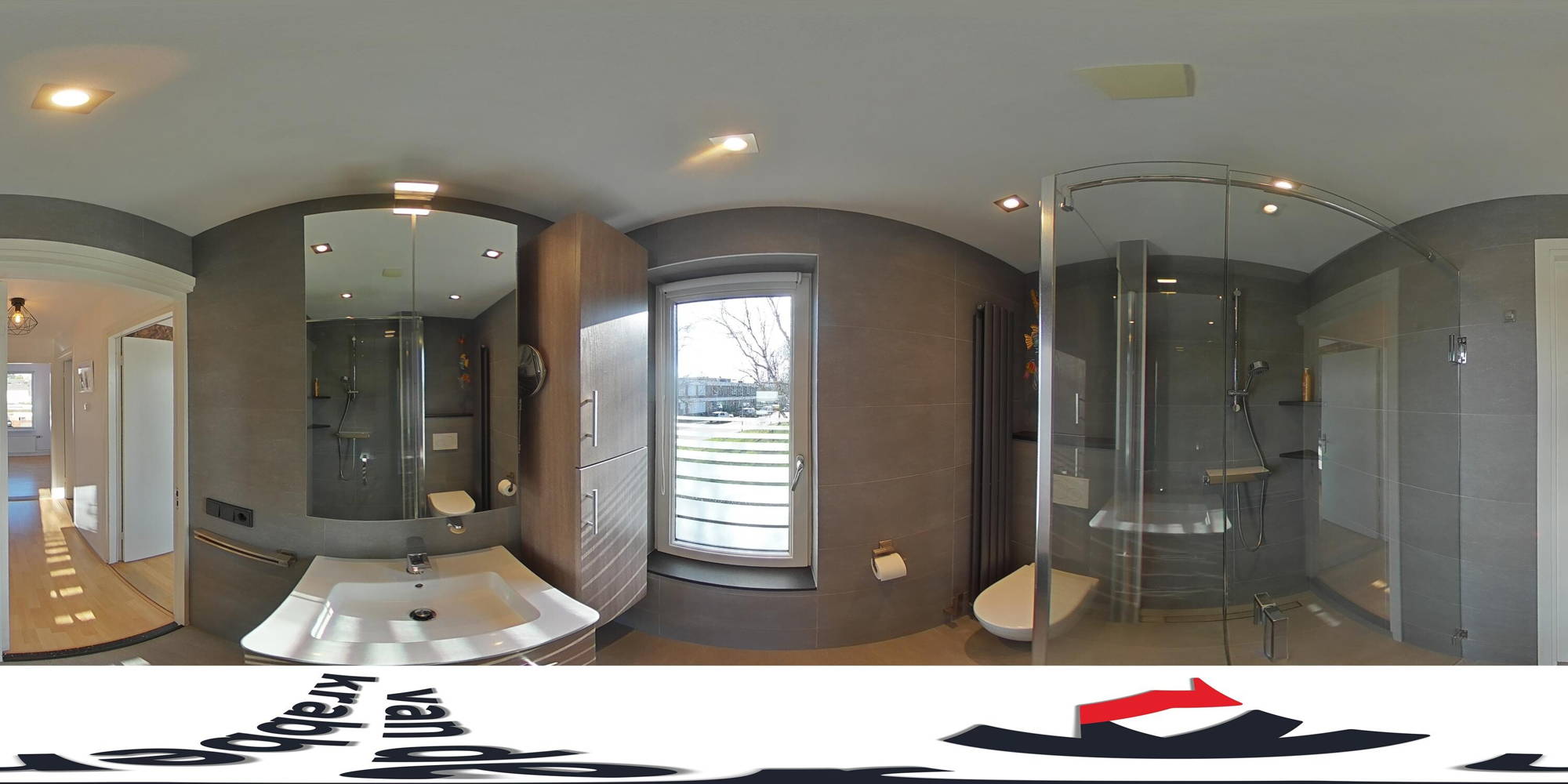 + Complete badkamer met douche, zwevend toilet, wastafelmeubel, vloerverwarming en designradiator.
