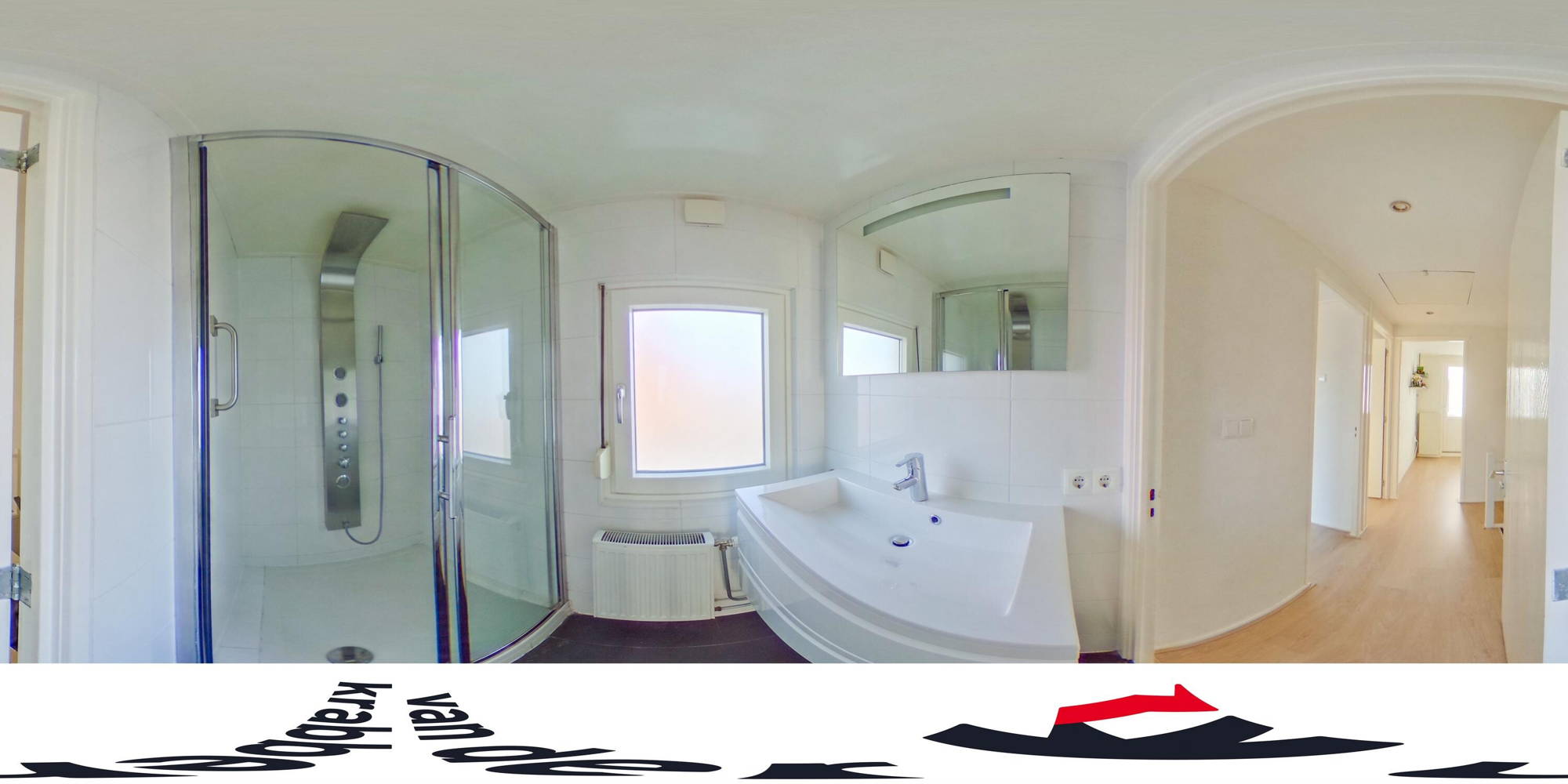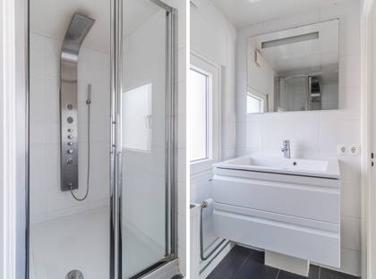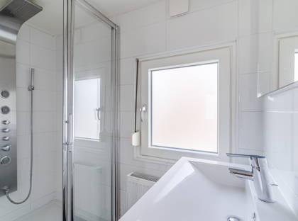 De badkamer is praktisch ingedeeld, met een raam voor natuurlijke ventilatie, een douche en een wastafel.