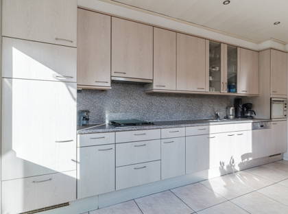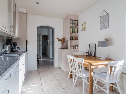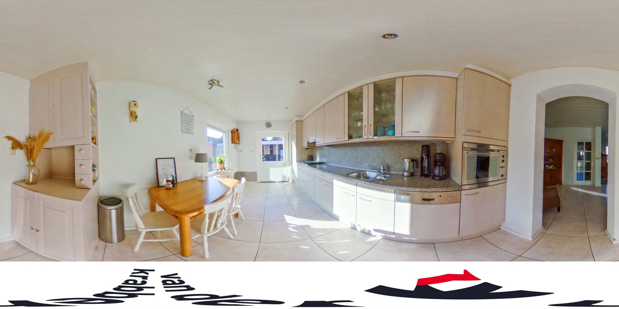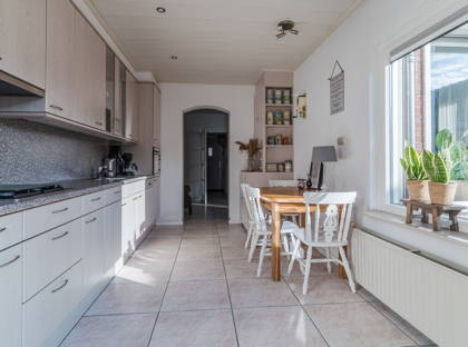 De keuken bevindt zich aan de achterzijde van de woning en is royaal van formaat. De keuken is functioneel ingericht met een 4-pits gaskookplaat, vaatwasser, koelkast, oven, en ruimte voor witgoedapparatuur. Hoewel de keuken in een oudere stijl is uitgevoerd, biedt de ruimte veel mogelijkheden voor modernisering en persoonlijke invulling. Vanuit de keuken is er toegang tot de zonnige achtertuin. Ook bevindt zich in de keuken de CV-ketel Remeha HR (2010).
