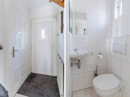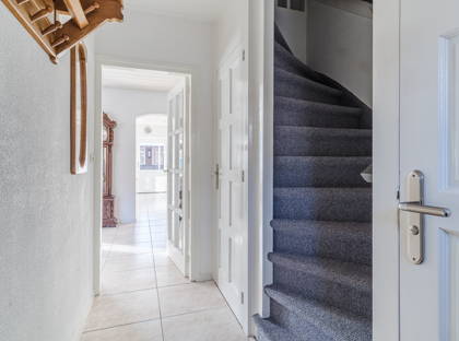 Via het tuinpad, parallel aan de oprit naar de garage, bereik je de voordeur. De hal biedt toegang tot de trapopgang, de trapkast met meterkast, en de woonkamer.