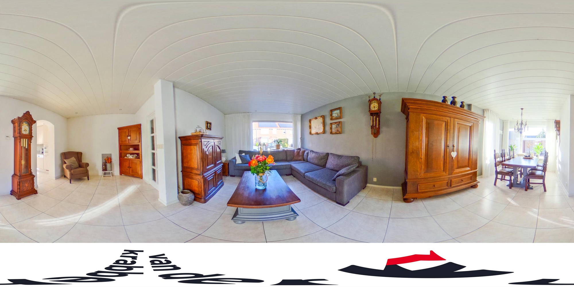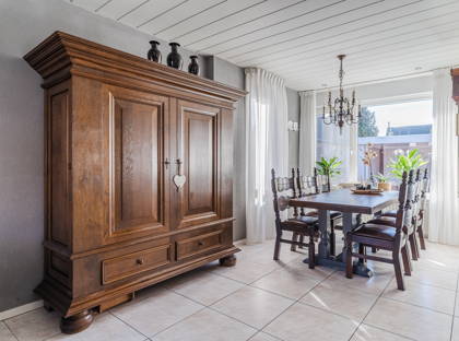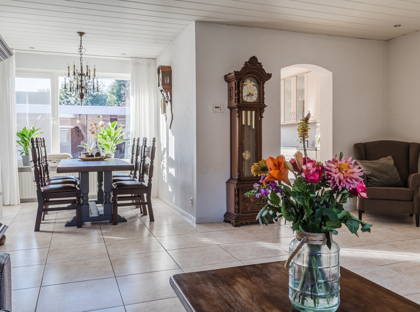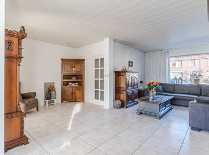 De woonkamer is ruim opgezet, heeft veel lichtinval en is afgewerkt met een lichte tegelvloer. De wanden zijn voorzien van spachtelputz en deels schrootjes, wat de ruimte een warme, huiselijke sfeer geeft. Dankzij de indeling is er plaats voor zowel een royale zithoek als een gezellige eethoek.