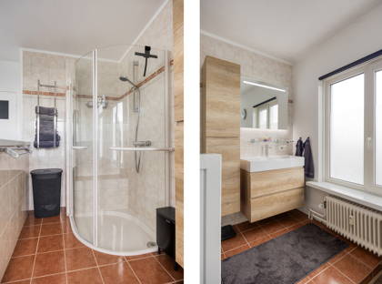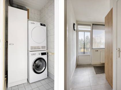 De keuken is praktisch ingericht en voorzien van een tegelvloer. Je beschikt onder andere over een koelkast, combimagnetron, 5-pits gaskookplaat, vaatwasser en een geiser voor warm water. Direct naast de keuken ligt een handige wasruimte met plek voor witgoed en extra opslag, ideaal om het dagelijkse leven overzichtelijk te houden.