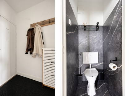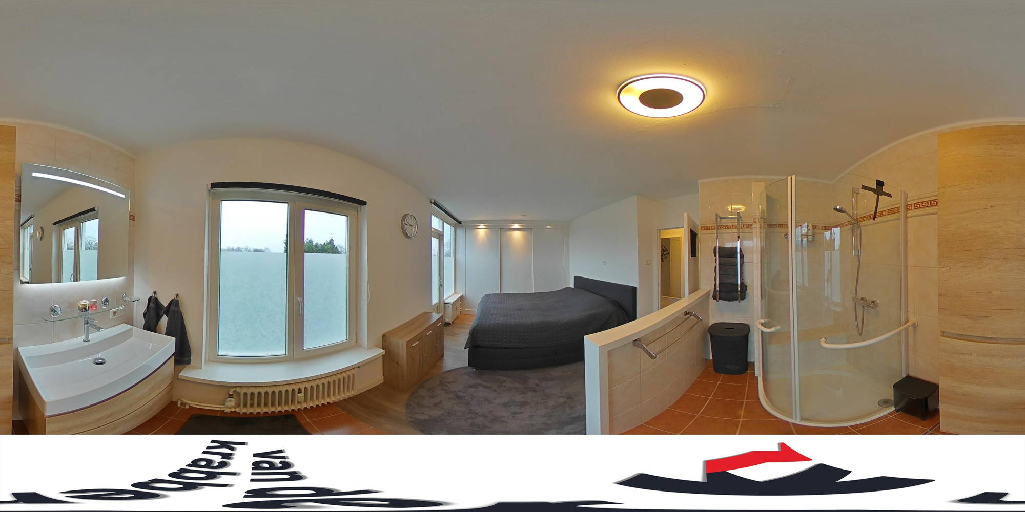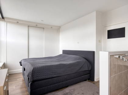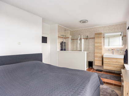 De slaapkamer is netjes afgewerkt met laminaat en strak stucwerk. Deze ruimte beschikt over een badkamer en suite, uitgerust met een douche, wastafel en moderne badkamermeubels met verlichte spiegel, die in 2025 zijn vernieuwd. Ook het toilet, dat zich apart in de hal bevindt, is in 2025 vernieuwd, wat zorgt voor extra comfort en privacy.