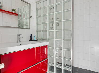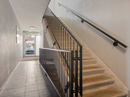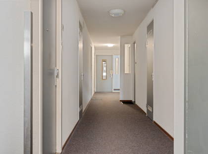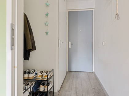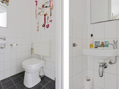 Via de gezamenlijke entree bereik je de hal van het appartement. Hier bevinden zich de meterkast en een ruime toiletruimte met fonteintje.