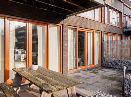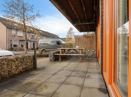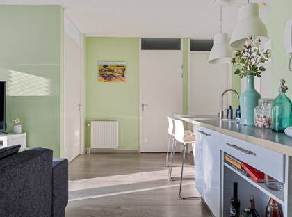 De woonkamer is licht en sfeervol afgewerkt met een laminaatvloer en biedt middels een schuifpui toegang tot het royale, onderhoudsarme terras. Door de ligging op het westen geniet je hier volop van de middag- en avondzon.