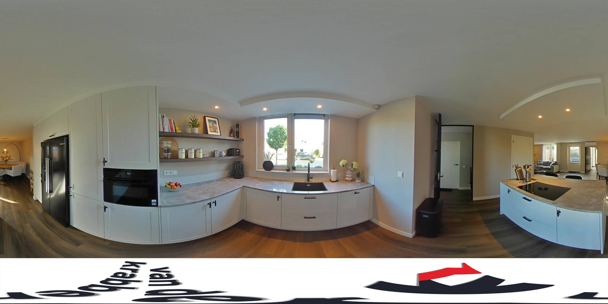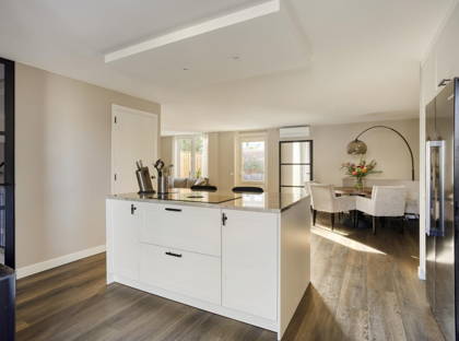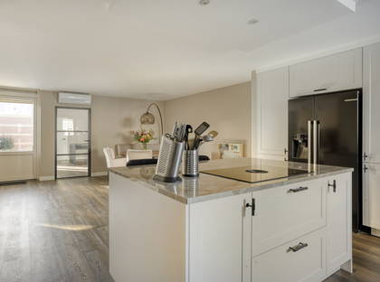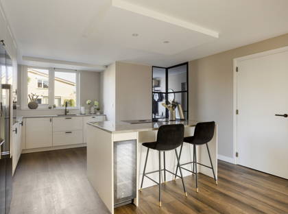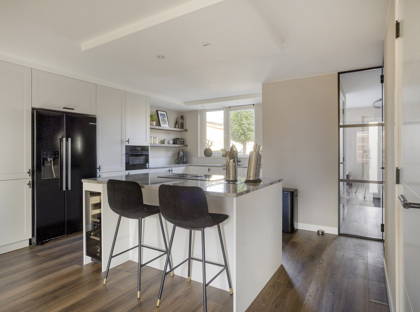 De keuken is een ware eyecatcher: luxe uitgevoerd met een Bora kookplaat, Amerikaanse koelkast, vaatwasser, Quooker en combi-oven.