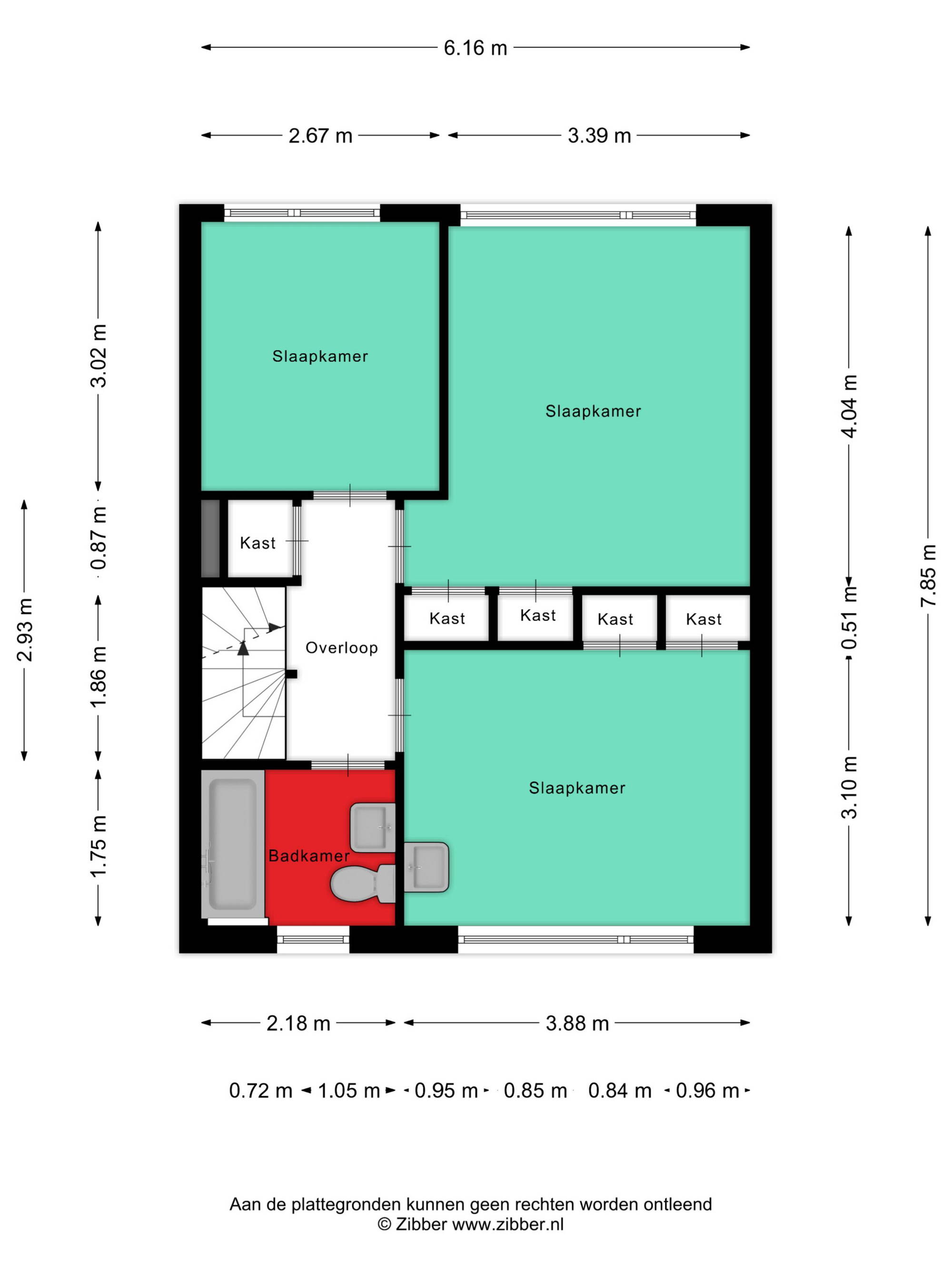 Op de eerste verdieping bevinden zich drie slaapkamers en een badkamer. De badkamer is compleet ingericht met een douche, wastafel en toilet.