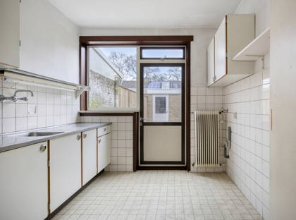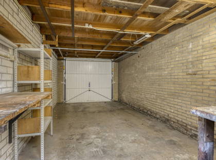 De keuken is praktisch ingericht en uitgerust met een koelkast, oven, gaskookplaat en afzuigkap. Vanuit de keuken is er toegang tot de achtertuin, die beschikt over een achterom en een aangebouwde houten berging. Aan de zijkant van het huis bevindt zich bovendien een garage.