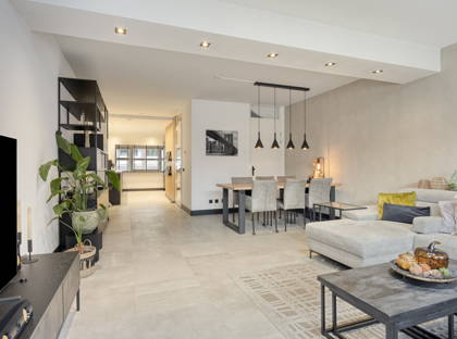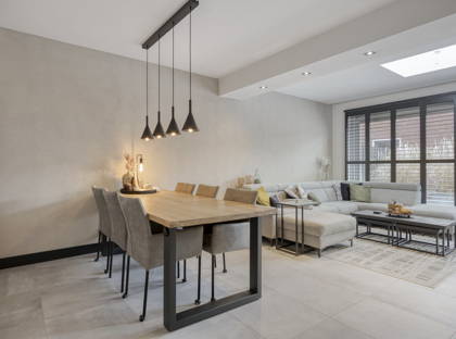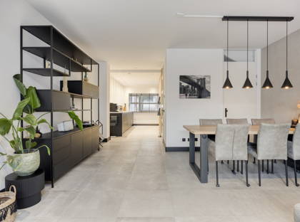 Via de entree met toiletruimte, garderobe, meterkast en trapopgang loopt u de ruime leefruimte binnen. De volledige begane grond is in 2022 vernieuwd en dat is te zien: een moderne tegelvloer met vloerverwarming, strak stucwerk en een frisse uitstraling kenmerken deze woonlaag.