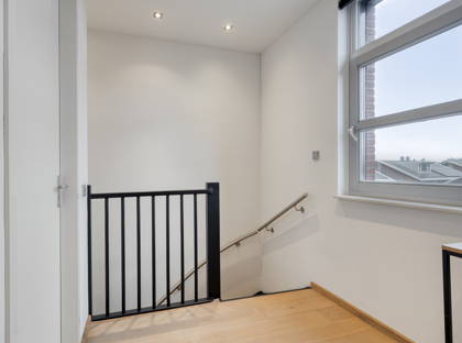 Een vaste trap leidt naar de tweede verdieping met nog twee slaapkamers, afgewerkt met lamelparketvloer en stucwerk wanden. Hier bevinden zich ook de aansluitingen voor de wasapparatuur, de CV-ketel (2023) en een vlizotrap naar de bergzolder.