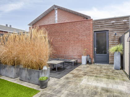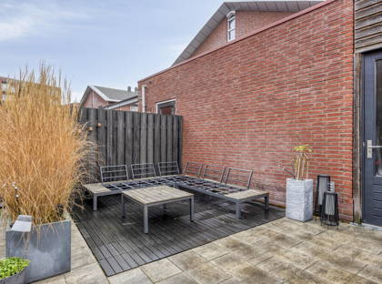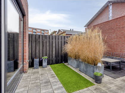 De achtertuin is onderhoudsvriendelijk aangelegd en gelegen op het oosten, waardoor u ’s ochtends heerlijk zonlicht binnen en buiten heeft. Achterin staat een houten berging met stroomvoorziening. De tuin is bereikbaar via de achterom en sluit aan op de gezamenlijke brandgang.
