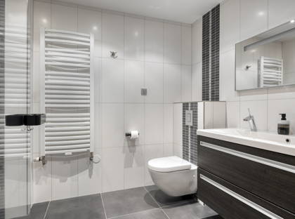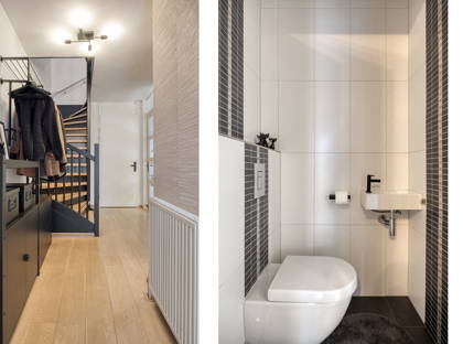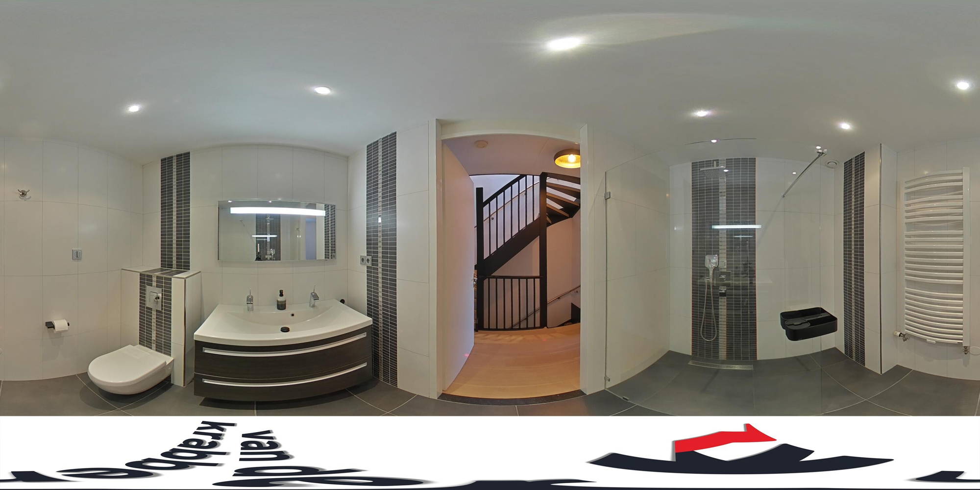 De badkamer op deze verdieping heeft een rustige uitstraling en is dankzij de slimme indeling prettig in gebruik. De ruimte is volledig betegeld in een moderne, tijdloze stijl. De inloopdouche biedt een comfortabele, ruime instap en is voorzien van een luxe regendouche. De dubbele wastafel met bijpassend meubel zorgt voor volop opbergruimte. Het toilet is netjes opgenomen in het geheel en met de aanwezige mechanische ventilatie blijft de badkamer altijd fris. Een verzorgde, complete badkamer die helemaal aansluit bij de moderne afwerking in de rest van de woning.