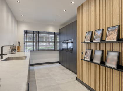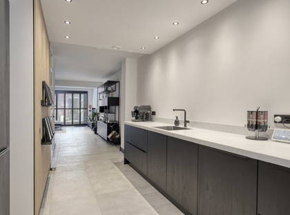Aan de voorzijde ligt de luxe keuken, eveneens vernieuwd in 2022. Deze is uitgerust met hoogwaardige inbouwapparatuur zoals een Bora-inductiekookplaat met geïntegreerde afzuiging, een oven, combi-oven, warmhoudlade, koelkast en vaatwasser. De ruime opstelling zorgt voor veel werk- en opbergruimte en maakt deze keuken tot een fijne plek om te koken én gezellig samen te komen.