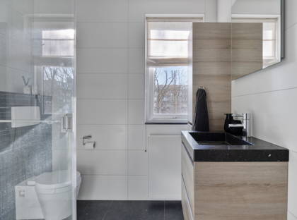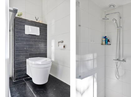 Op de eerste verdieping bevinden zich twee slaapkamers (makkelijk 3 van te maken) en de badkamer. De slaapkamers zijn prettig van formaat en multifunctioneel te gebruiken. De grootste slaapkamer is voorzien van laminaat, strak spuitwerk, rolluiken en airconditioning. De badkamer is praktisch ingericht en beschikt over een douchecabine, wandtoilet en een hangend badkamermeubel met natuurstenen wastafel.