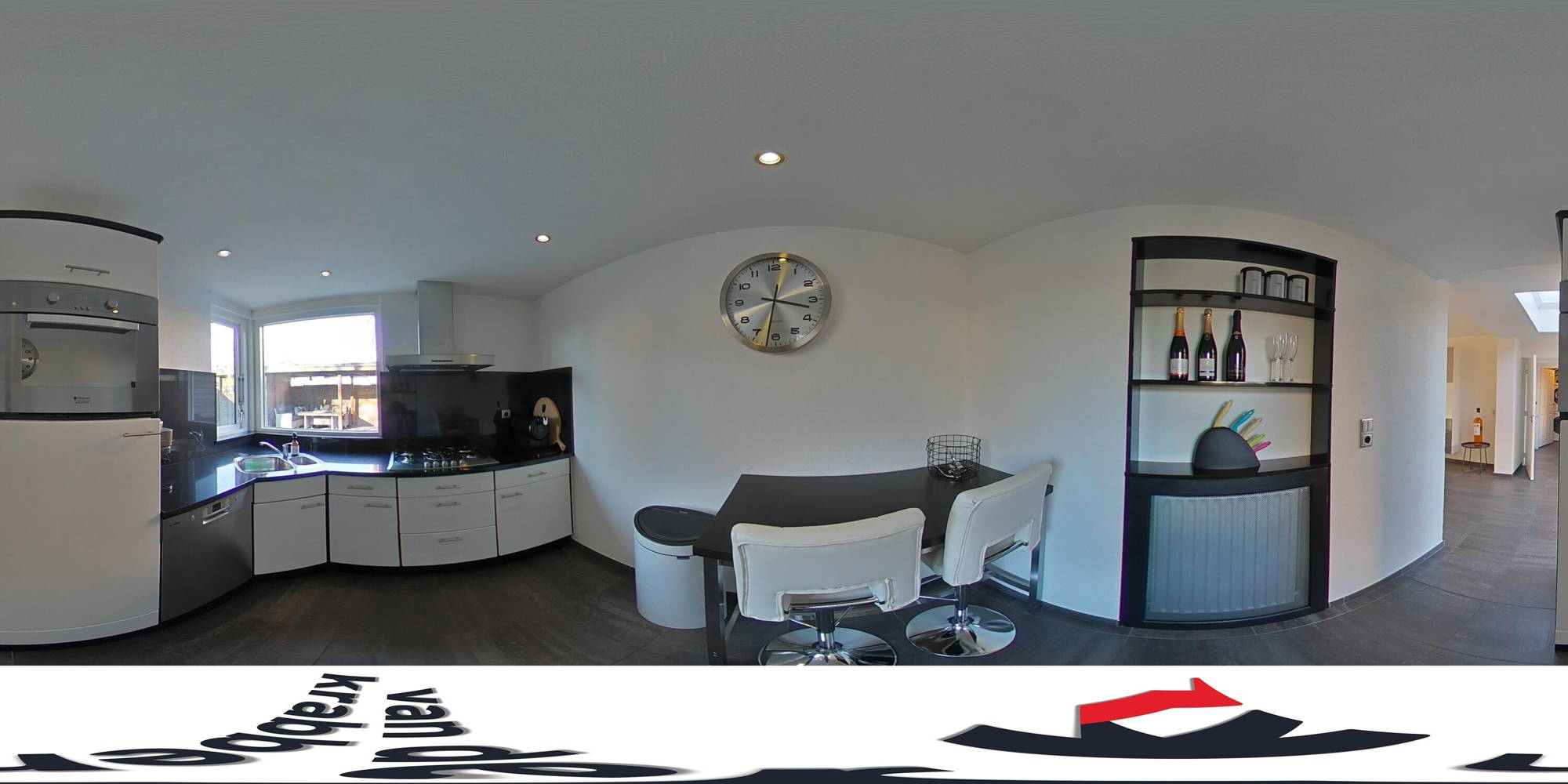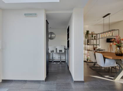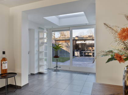 Bij binnenkomst kom je in de hal met meterkast en toegang tot de woonkamer. De woonkamer is afgewerkt met een tegelvloer en strak spuitwerk en beschikt over een praktische trapkast. Vanuit hier heb je een fijne verbinding met de tuinkamer, waardoor er een prettige en lichte leefruimte ontstaat. De naastgelegen keuken is geplaatst in een hoekopstelling onder een hoekraam, wat zorgt voor extra licht en uitzicht tijdens het koken. Het keukenblok is uitgevoerd met een natuurstenen werkblad en beschikt over diverse inbouwapparatuur, waaronder een gaskookplaat, afzuigkap, combimagnetron, koelkast en vaatwasser. Vanuit de keuken is er toegang tot een praktische ruimte waar de wasmachine en droger staan opgesteld.