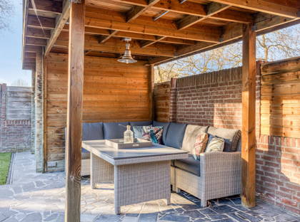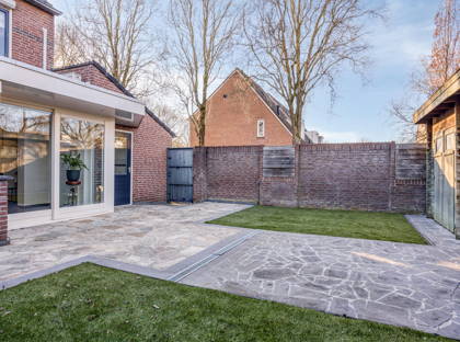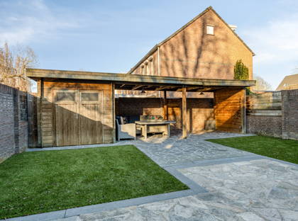 Ook buiten biedt de woning veel ruimte en privacy. De royale achtertuin is een heerlijke plek om te genieten van de zon. Er zijn verschillende plekken om te zitten, zoals het terras direct bij de woning, het gazon of onder de ruime houten overkapping achter in de tuin. In deze veranda is tevens een praktische tuinschuur geïntegreerd.