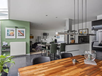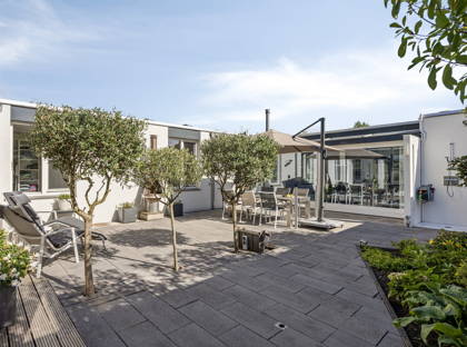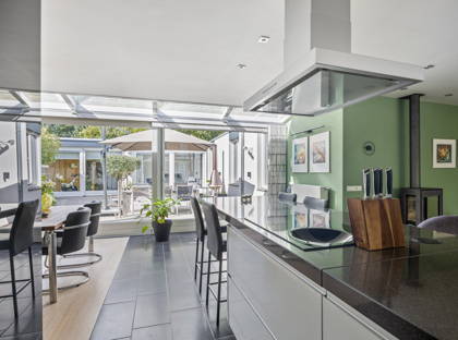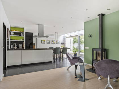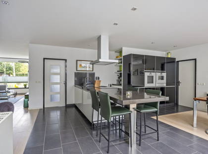 + De L-vormige woonkamer met zonneluifel is licht en ruim en biedt meerdere zithoeken, waaronder een gezellige plek bij de sfeervolle haard. Dankzij de airconditioning met koel- en verwarmingsfunctie is het hier het hele jaar door comfortabel. De ruimte loopt naadloos over in de uitgebouwde woonkeuken met lichtstraat en schuifpui naar de tuin.