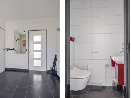 + Via de overdekte voordeur stap je binnen in de entree met de meterkast (16 groepen en 4 aardlekschakelaars) en moderne toiletruimte met wandtoilet en fonteintje.
