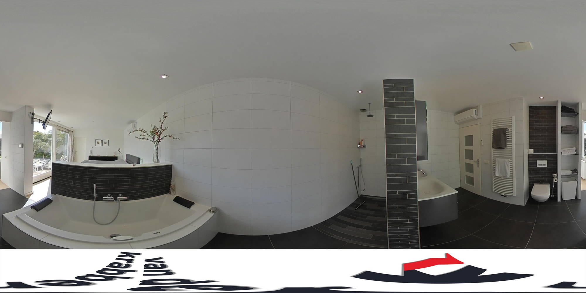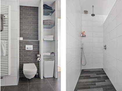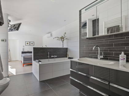 + De badkamer en suite is luxe uitgevoerd met vloerverwarming, een ruime inloopdouche, ligbad, dubbele wastafel met badkamermeubel, wandtoilet en designradiator.