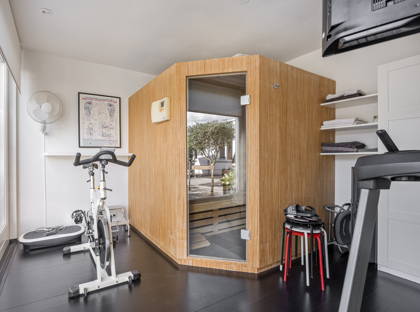 + De lange gang brengt je naar het slaapgedeelte van de woning met drie volwaardige slaapkamers, een badkamer en walk-in closet en suite, een wellnessruimte met sauna en een separate doucheruimte.