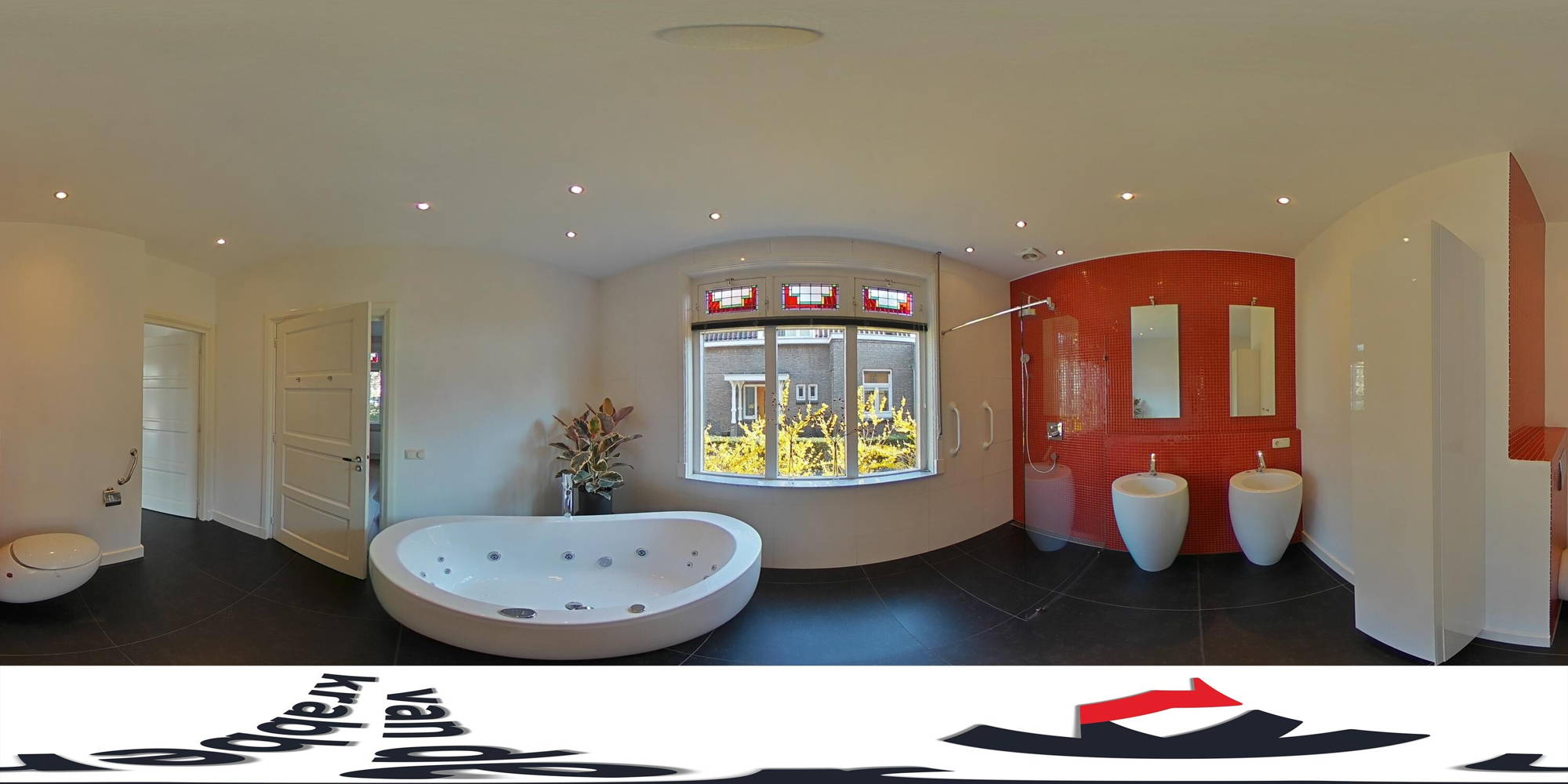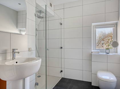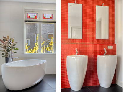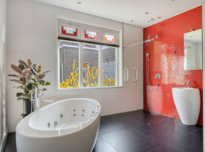 De slaapkamer en badkamer op de begane grond maken dit een levensloopbestendige woning. De luxe badkamer is voorzien van bubbelbad met jetstream, inloopdouche, 2 vrijstaande wasmeubels en toilet. De rode mozaïektegeltjeswand in deze badkamer matcht bij de glas-in-loodraampjes. En de grote donkere tegels inclusief vloerverwarming brengen het geheel weer in balans.