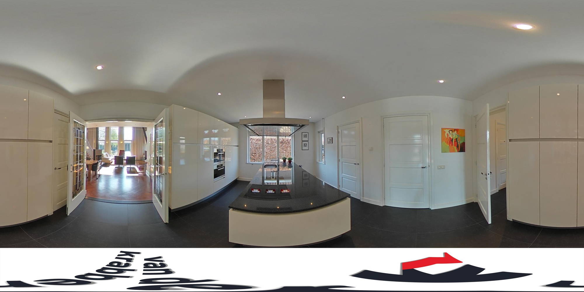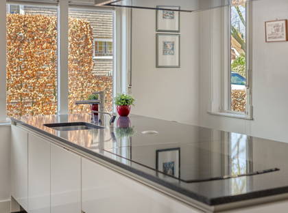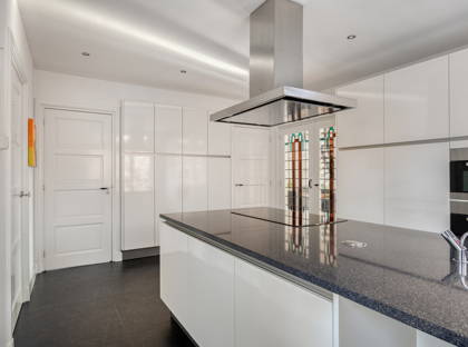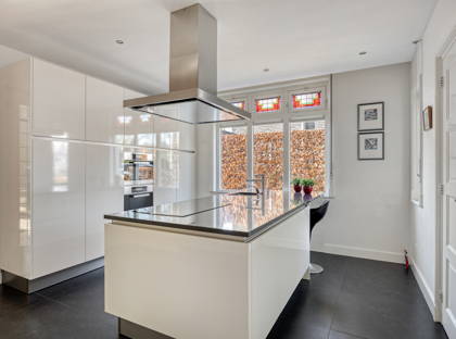 Vanuit de woonkamer loop je, door de openslaande glas-in-lood-deuren, de keuken in. Een moderne luxe Siematic keuken met groot kookeiland met antraciet granieten blad. Ook hier vind je weer die authentieke jaren 30-details terug. Verder is er een 4-pits inductie-kookplaat, Quooker, combi-oven, stoomoven, diepvries, vaatwasser en vloerverwarming. En je hebt enorm veel kastruimte, zowel in het kookeiland als daaromheen. Vanuit de keuken bereik je de originele kelder, een handige plek om voorraden koel te bewaren. Tevens vind je achter een deur in de keuken een praktische ruimte met daarin de aansluitingen voor de wasmachine en de droger.