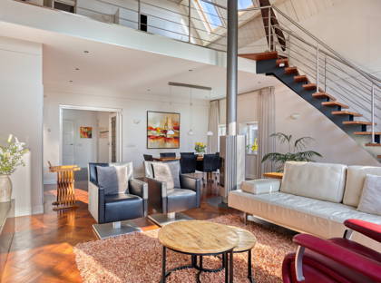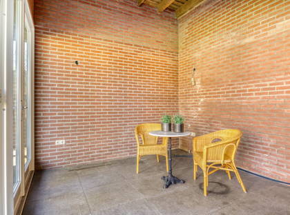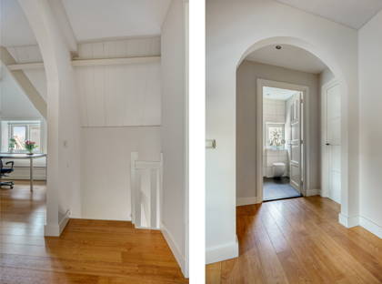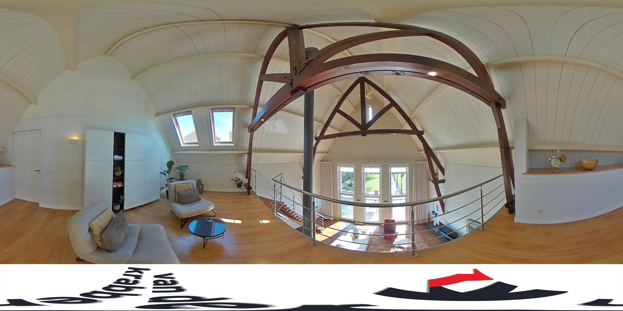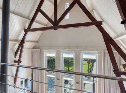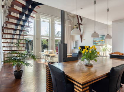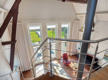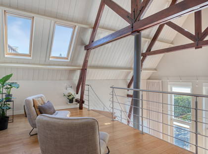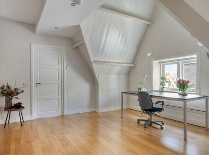 + Woonkamer met vide, waardoor de woonkamer zelf een ontzettend lichte en hoge ruimte is. Een ruimte vol karakter – mede doordat je zicht hebt op de houten balken van het plafond.