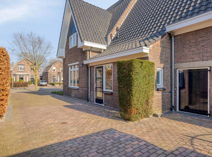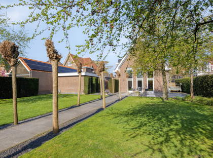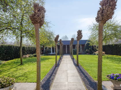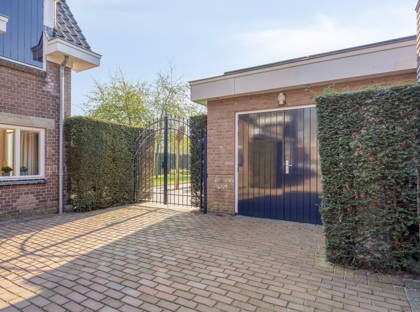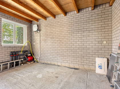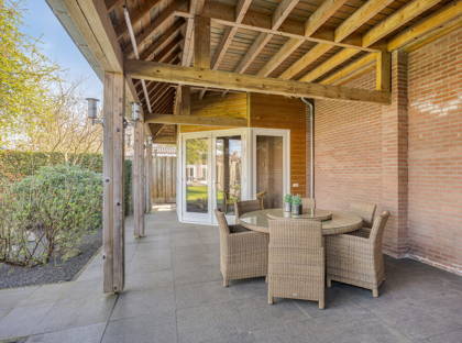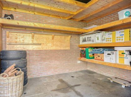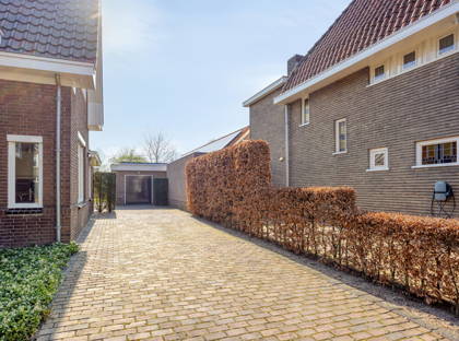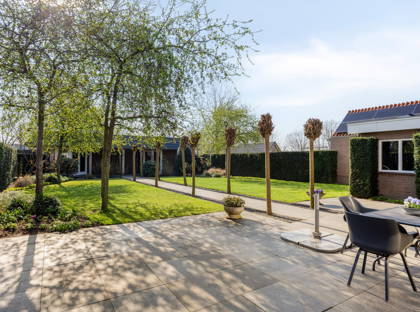 Door naar de ruime tuin. Een fijne plek met veel privacy. Door het lange tegelpad tussen het gazon wordt het accent op de diepte van de tuin gelegd. De boompjes maken het een harmonisch en mooi groen geheel. Nog zo’n topplek: het terras aan het huis. Hier kun je heerlijk een kopje koffiedrinken of uren tafelen. Achter in de tuin vind je verder een ruime overkapping met een tweede terras met hierbij aan weerszijde in steen opgetrokken (berg)ruimtes. Naast het huis ligt een lange oprit met aansluitend een garage.