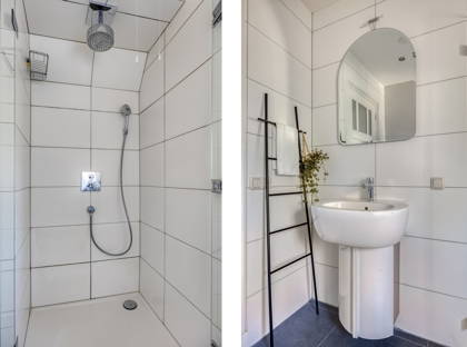 + In totaal 2 badkamers: badkamer beneden is een luxe badkamer met bubbelbad met jetstream, inloopdouche, vrijstaande wasmeubels en toilet. Badkamer op de 1e verdieping is voorzien van douche, wc, wastafel en elektrische vloerverwarming.