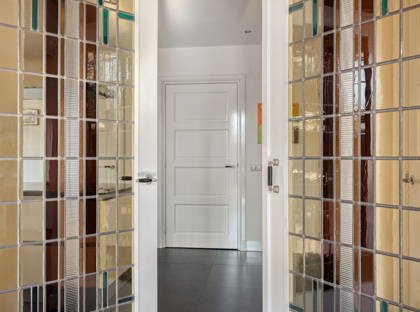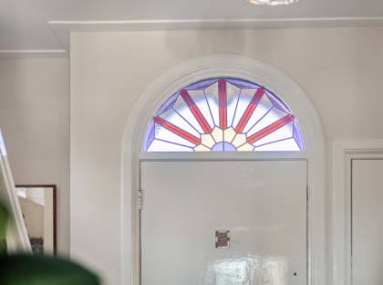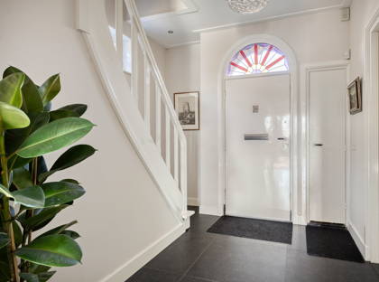 Aan het halfronde glas-in-loodraampje boven de voordeur zie je direct dat je bij een jaren 30-woning bent. Enorm sfeervol. In de ruime entree aan de zijkant van het huis vind je verder het toilet en een ruimte om de jassen op te hangen.
