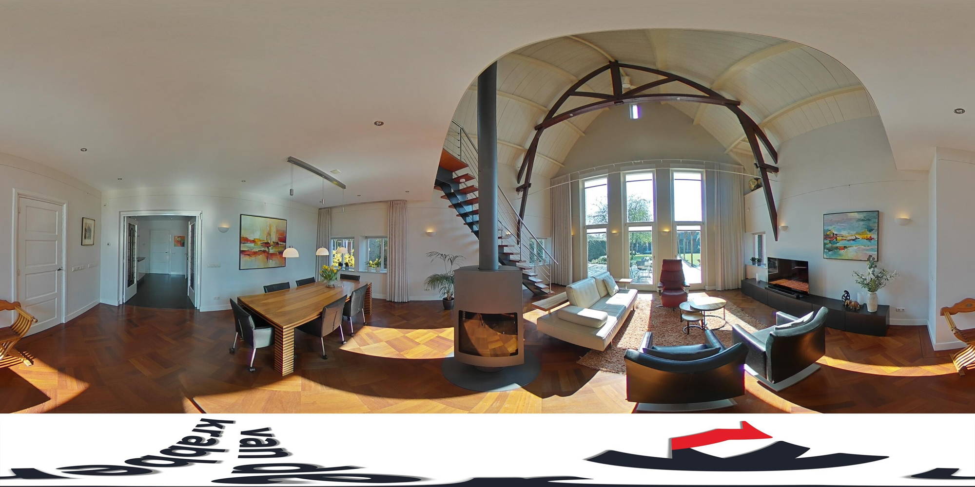 Vanuit deze entree stap je de woonkamer binnen. Een oase van rust én licht. Door de vide in de woonkamer is deze ruimte ontzettend hoog – je ziet de houten balken en het dak. Dat geeft het huis echt karakter! De hoge ramen zorgen hier voor een prachtige lichtinval en uitzicht op de tuin. Verder vind je in de woonkamer een gezellige houtkachel en ligt er een houten vloer met vloerverwarming.