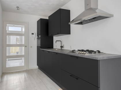 De keuken is uitgerust met moderne inbouwapparatuur, waaronder een vaatwasser, koelkast, combi-oven, 4-pits inductiekookplaat, afzuigkap en een kunststof werkblad – allemaal uitgevoerd in een frisse, eigentijdse stijl.